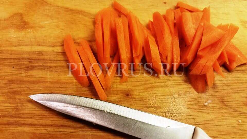 Так что только нож с хорошим острым лезвием вам в помощь! Большую морковь нужно разрезать пополам или же делить на три — чрезмерно длинные кусочки все равно при приготовлении поломаются. Когда таким образом порежете — разрезаем на плов.