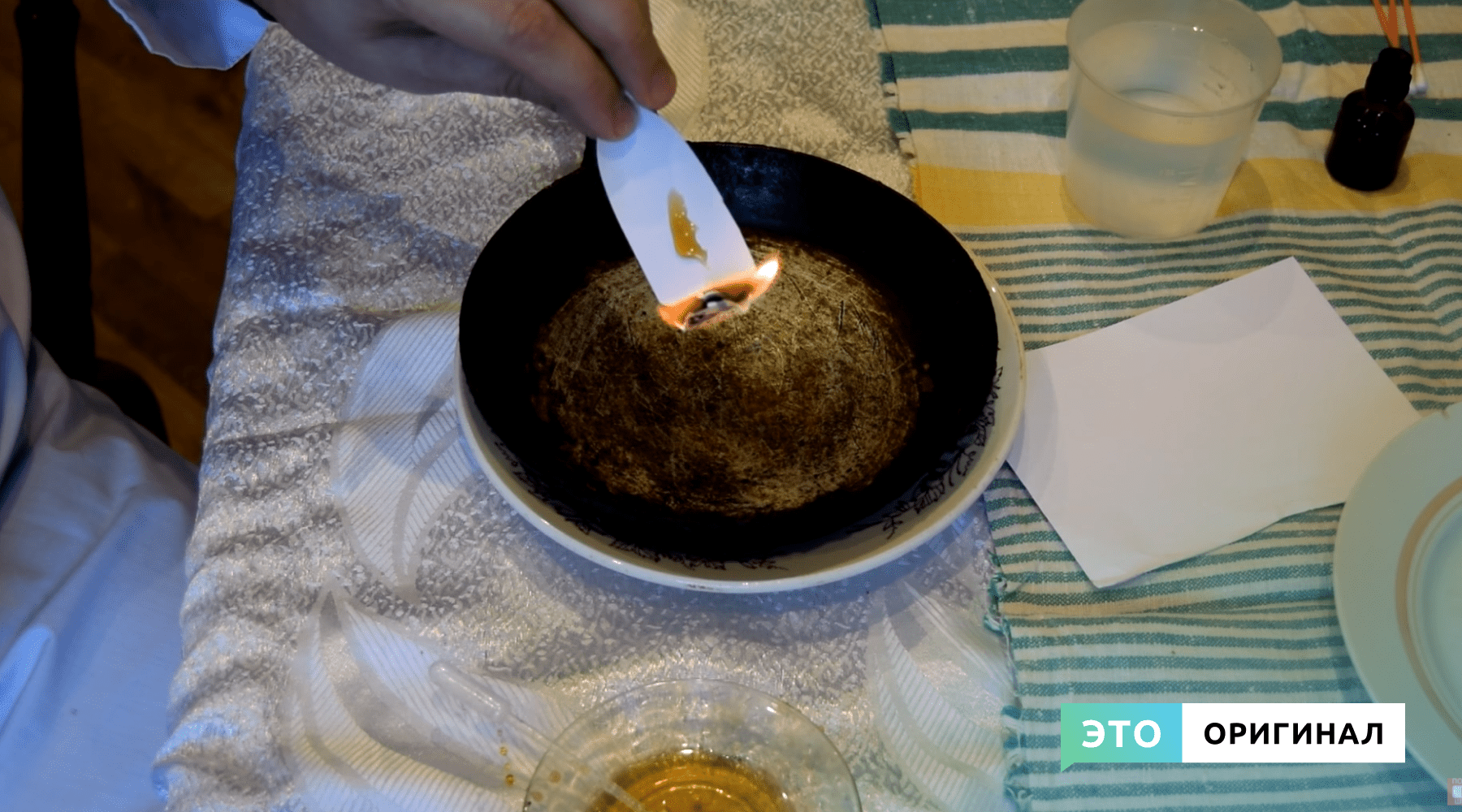 - Способ второй. Для этого берётся бумага, на которую капают пчелиное лакомство. Затем бумажное изделие поджигают и оценивают результат. Если продукт качественный, то бумага сгорит, а мёд останется нетронутым. Он не почернеет и не обуглится. Подделка запахнет жжёным сахаром, расплавится и потемнеет до коричневого цвета.