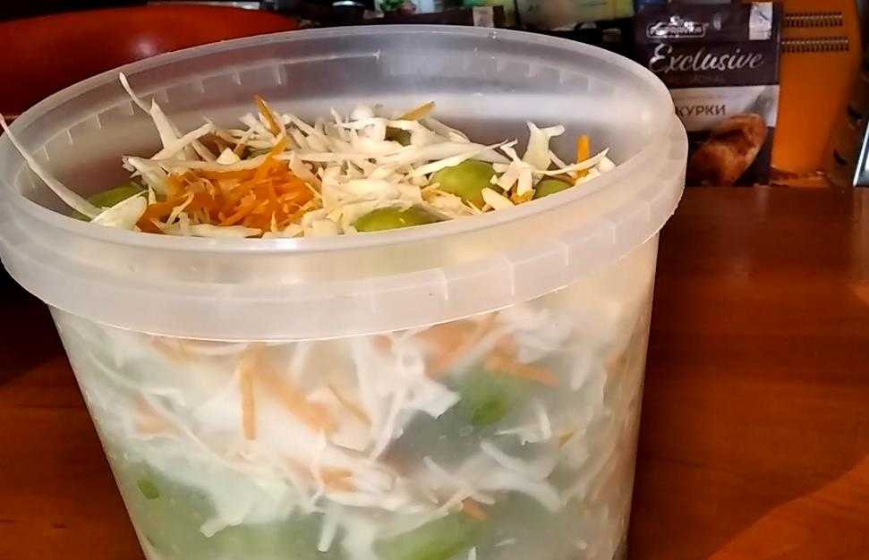 - Сверху располагается гнет. Салат остается настаиваться 2 дня. Спустя это время обалденная капуста готова к употреблению. Для хранения удобно разложить салат по банкам, хранить в холодильнике.