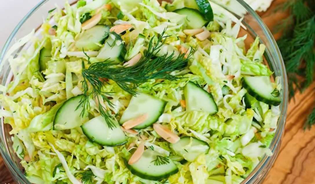 Овощной салат весной и летом – не просто бюджетное питание. Бесплатное. Со свежими парниковыми огурцами и редиской капуста образует вкуснейшую закуску.