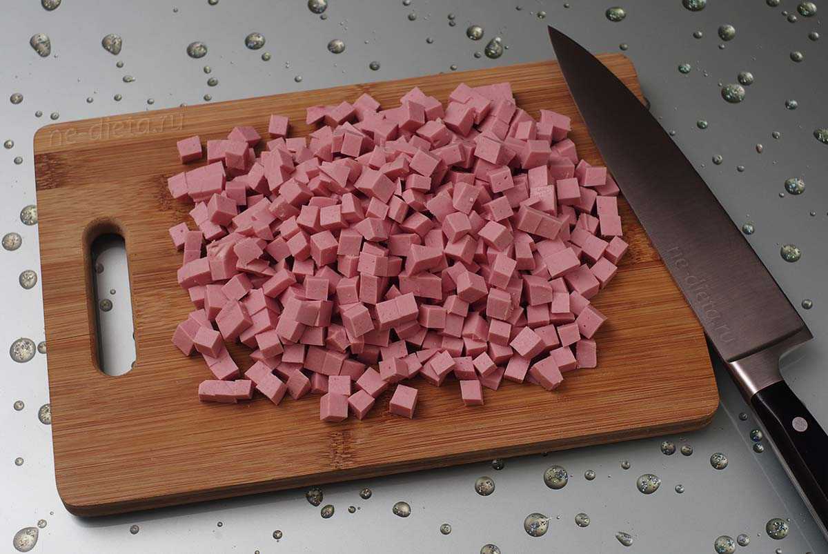 Докторскую колбасу нарезать красивыми одинаковыми кубиками.