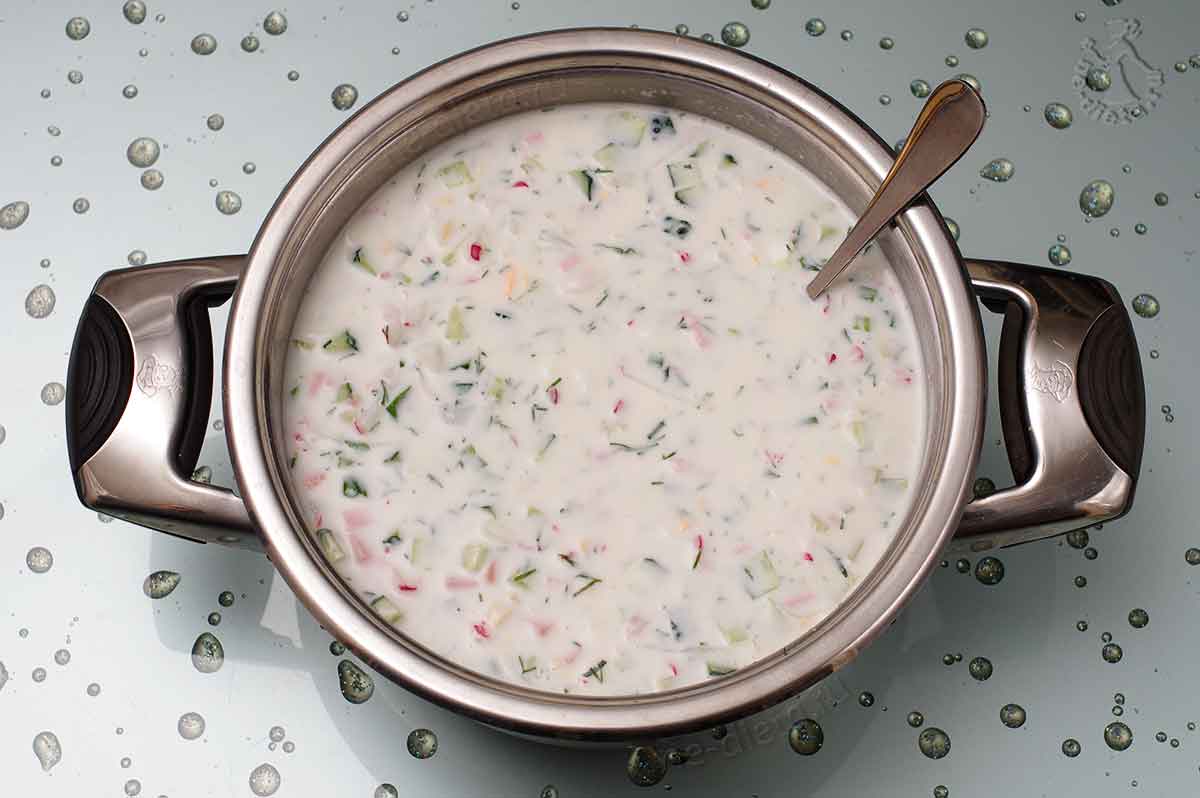 Далее нужно постепенно влить остуженную кипяченую воду, чтобы получить такую консистенцию окрошки, которая вам нравится. Кстати говоря, вместо обычной воды в данном случае можно использовать минералку, а точнее, самую простую газированную воду без солей, но лично мне это кажется излишним, поскольку в кефире вполне хватает газов. В конце приготовления не забудьте попробовать окрошку и при необходимости посолить/поперчить, а кроме того, в нее можно добавить немного лимонного сока по вкусу, если при дегустации вам покажется, что в блюде не хватает кислоты.