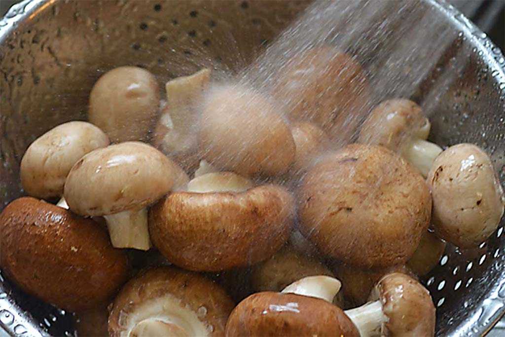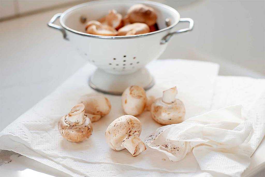 Ополосните грибы и промокните их бумажным полотенцем. Грибы можно промыть вручную или положить все в дуршлаг и промыть под струёй воды. Если есть большие куски грязи, слегка протрите грибы пальцами.