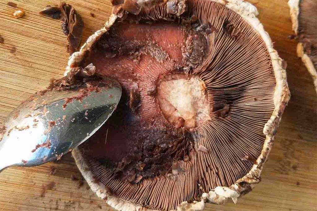 Удалите с грибов жабры и ножки. Жабры на грибах портобелло съедобны, но при приготовлении они выделяют темную жидкость. Ложкой аккуратно поскребите и удалите их. У грибов с ножками срежьте твердые концы ножом.