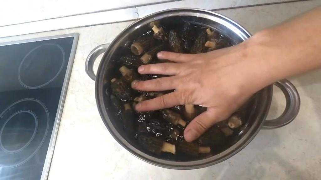 После промывания сморчки замачивают в прохладной воде на час, потом воду сливают, заменяют новой. Манипуляцию проделывают до тех пор, пока вода не будет оставаться прозрачной. Иногда хватает одного раза, иногда приходится замачивать сморчки трижды или даже четырежды.