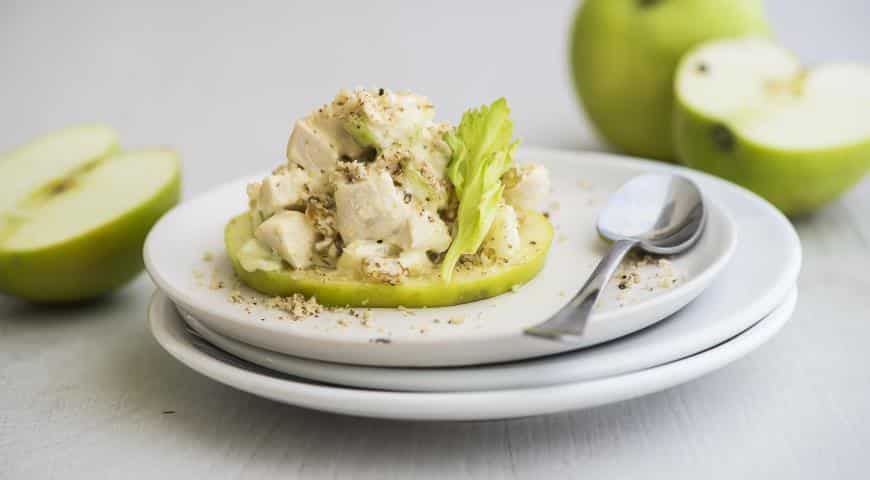 - Потереть большое кисло-сладкое яблоко, столько же сельдерея крупно на терке, смешать, полить соусом.