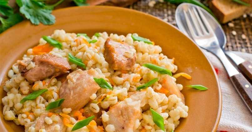 В красивую перловую кашу для насыщенности добавьте мяса. Начинайте варить их вместе на плите, затем томите в духовке, чтобы крупа сильно разбухла и стала совсем прозрачной, а мясо размягчилось. Готовить нужно совсем без масла, мясо и так добавит жирности, особенно свинина. Если вы “мясоед”, то получите отличный вариант блюда для вкусного питательного обеда. Обязательно подайте к столу зелени и свежих овощей – и наслаждайтесь.